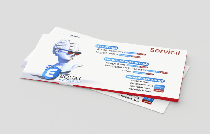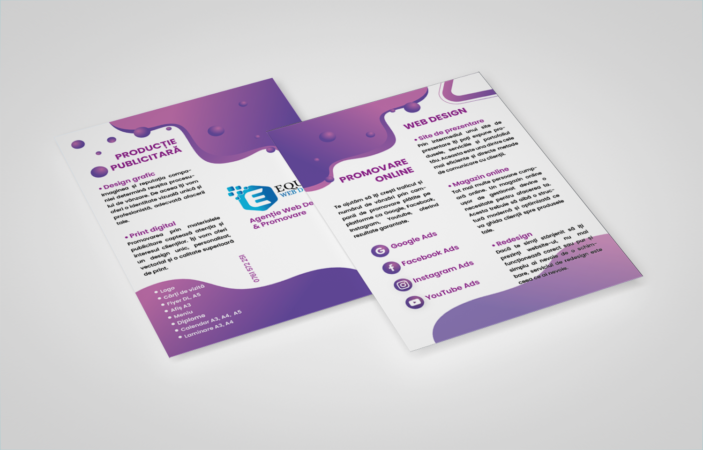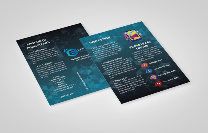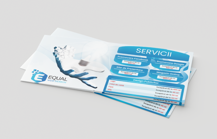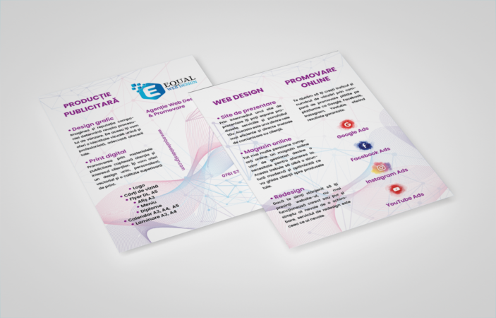 Un branding adecvat poate aduce vânzări considerabile companiei dumneavoastră nu doar a unui singur produs, ci și a altor produse asociate cu ale brandului. Un brand este constituit din mai multe elemente : logo ( identitatea vizuală ), design grafic, un slogan, nume etc. Portofoliul nostru de proiecte cuprinde produse personalizate și atrăgătoare care te ajută să îți prezinți în viitor afacerea clienților tăi. Realizăm flyere, pliante, afișe, cărți de vizită, meniuri, cataloage. Orice ai nevoie în materie de design publicitar pentru promovare companiei tale.